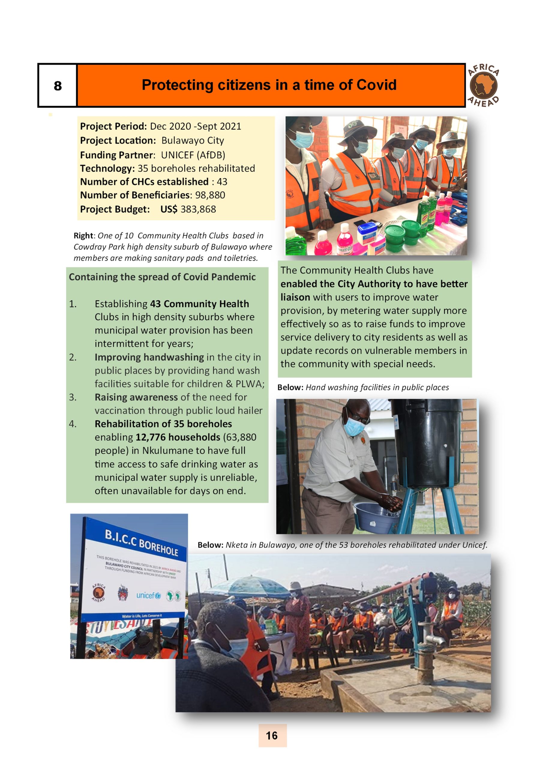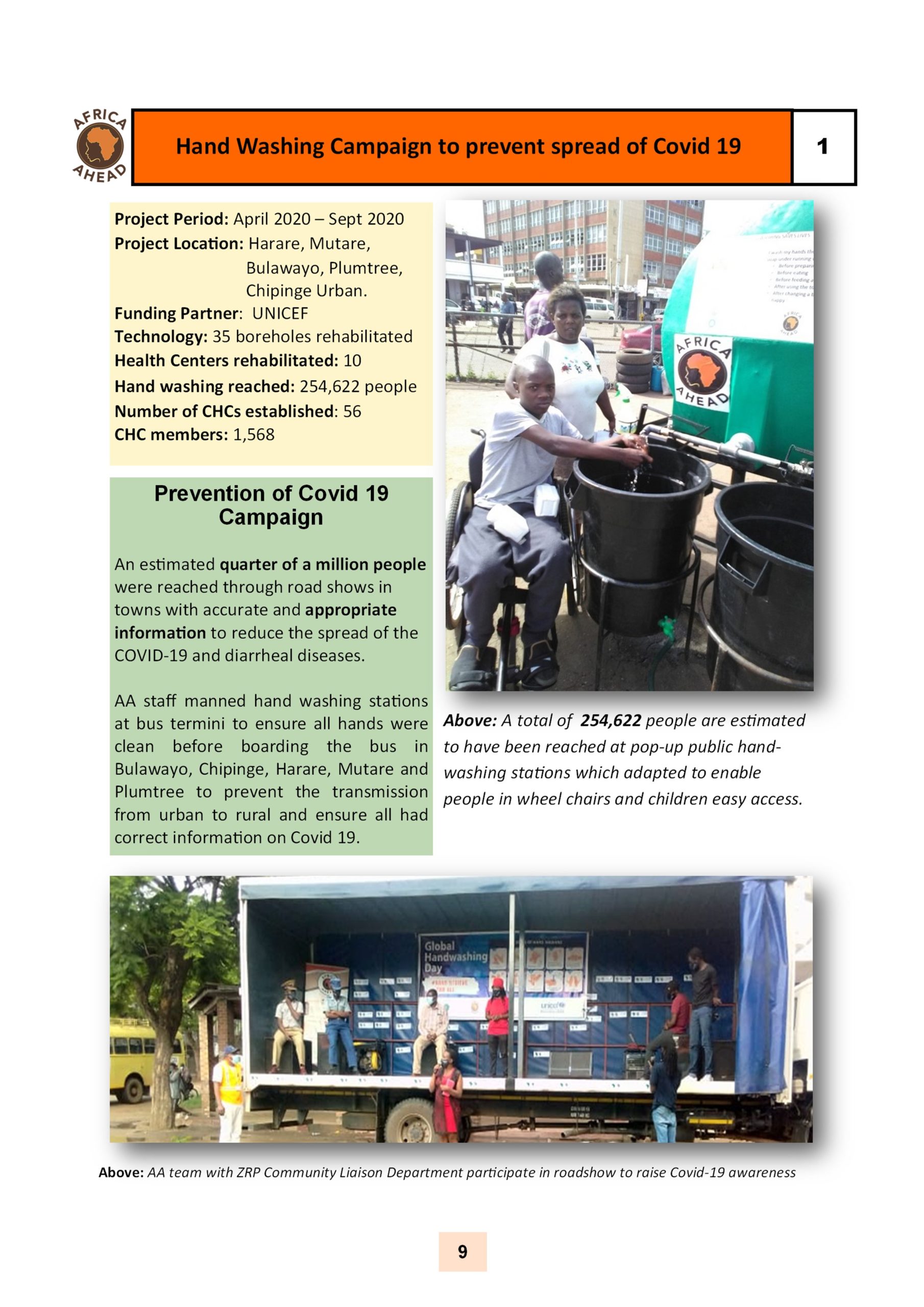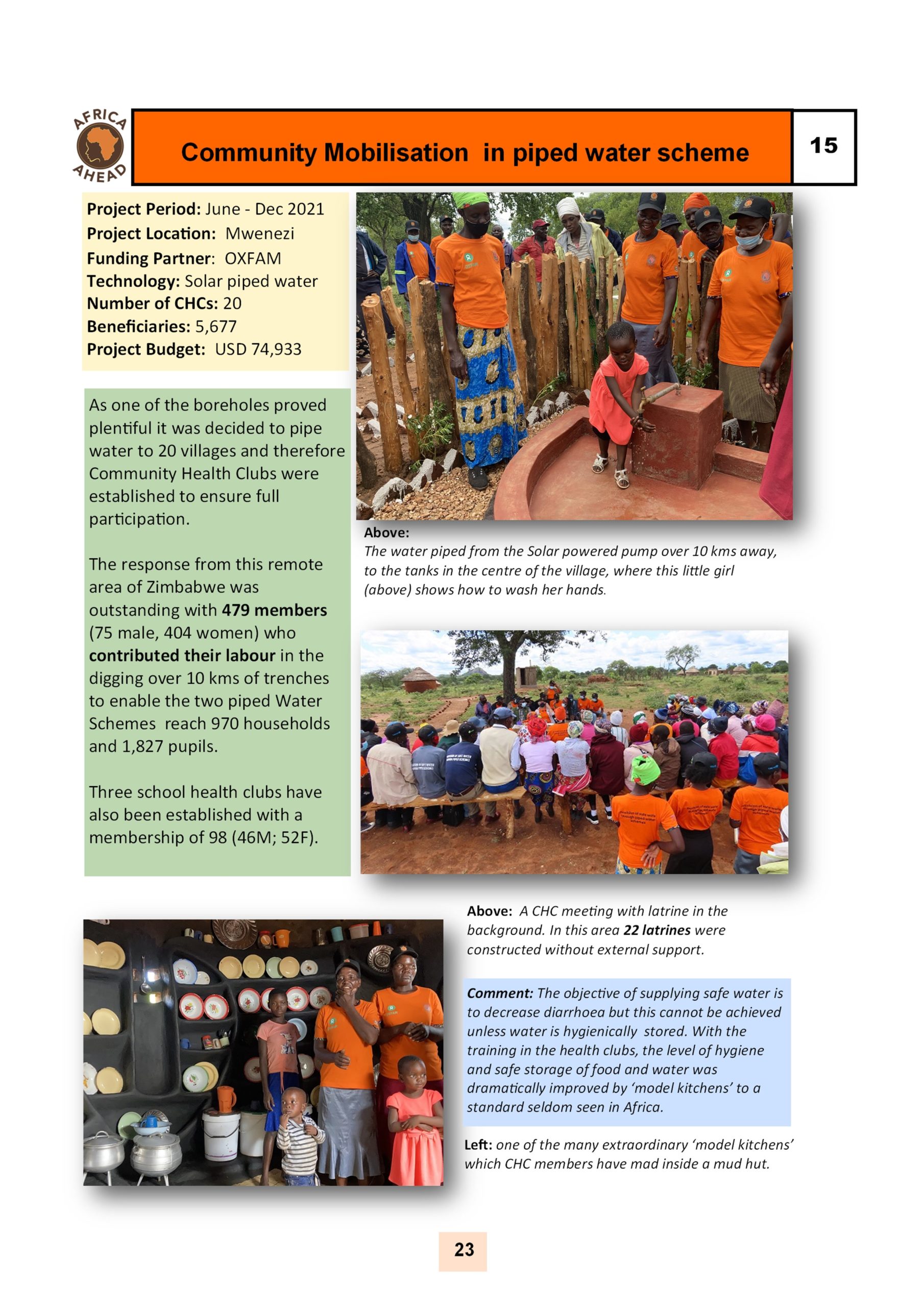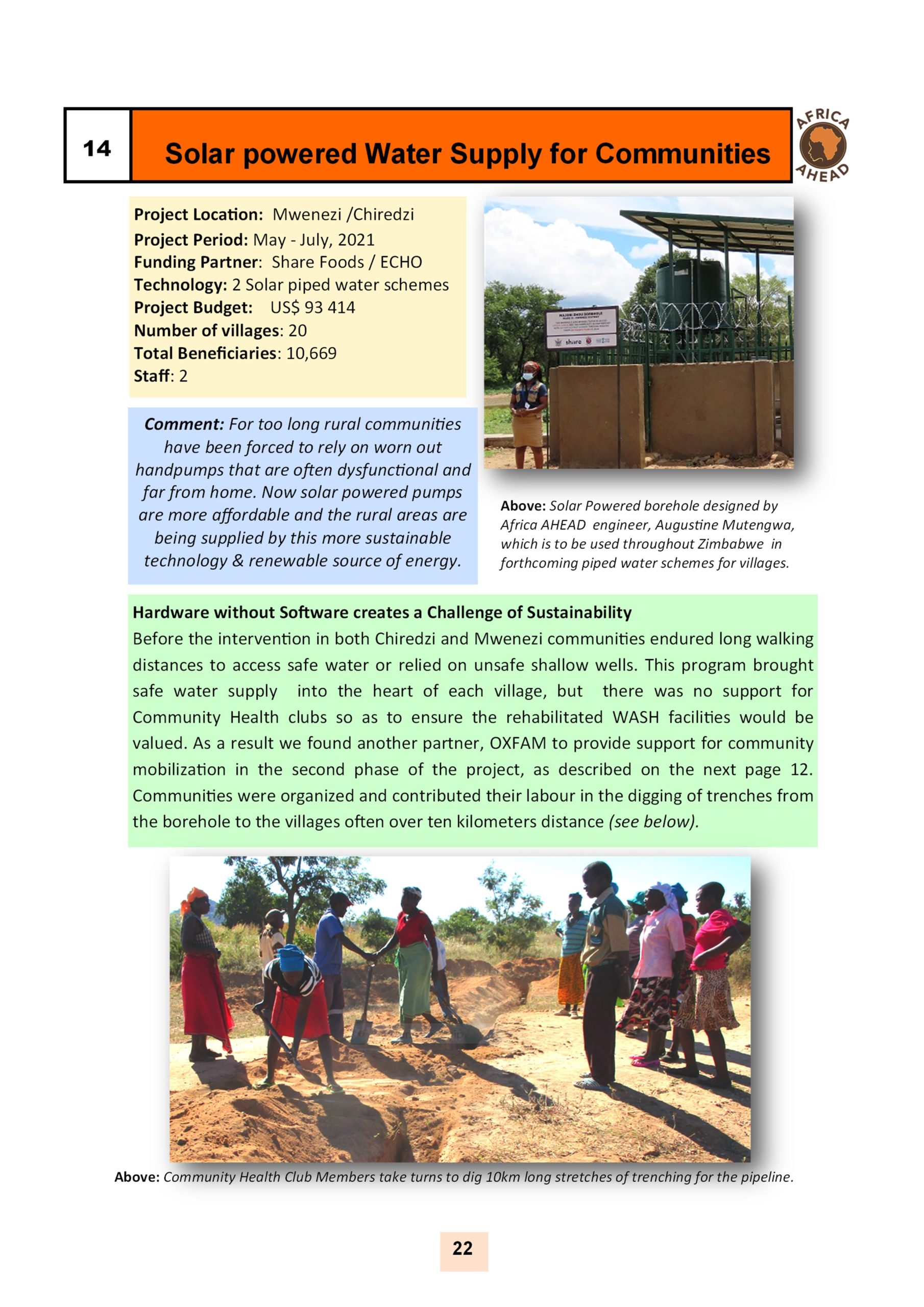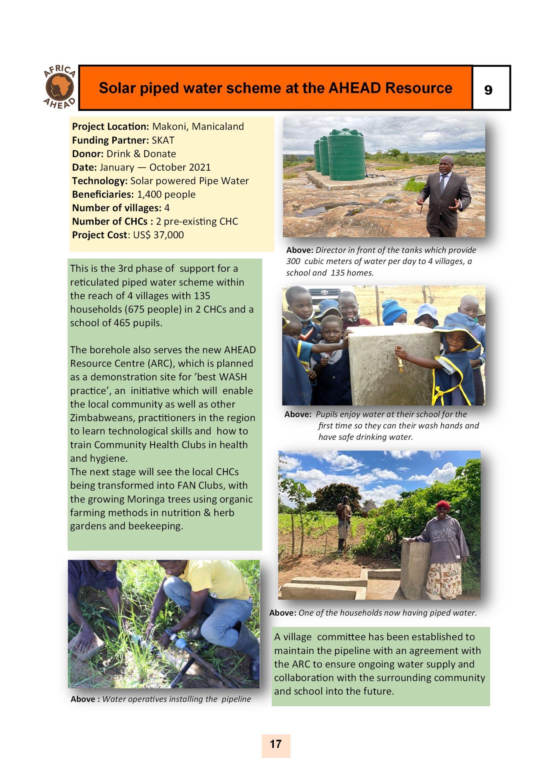 The year 2022, sees Africa AHEAD flying high, with projects throughout the country, and a strong role within Zimbabwe for the control of Covid 19, providing handwashing stations, heading health promotion campaigns, road shows, radio programmes as well as upgrading infrastructure at Health Centers around the county, and installing 22 solar powered piped water schemes in rural areas, using our Community Health Clubs to mobilise support and ensure sustainability.