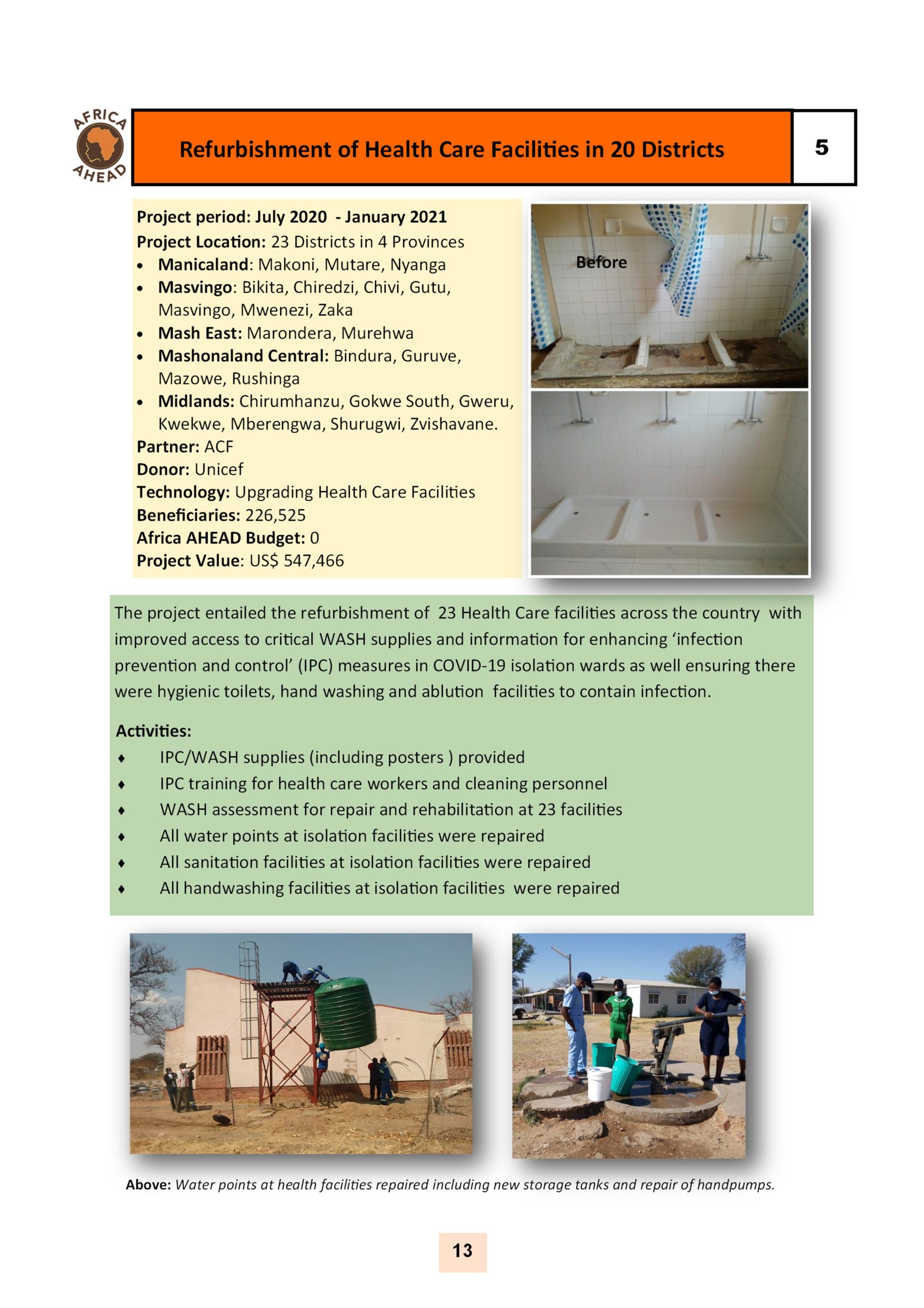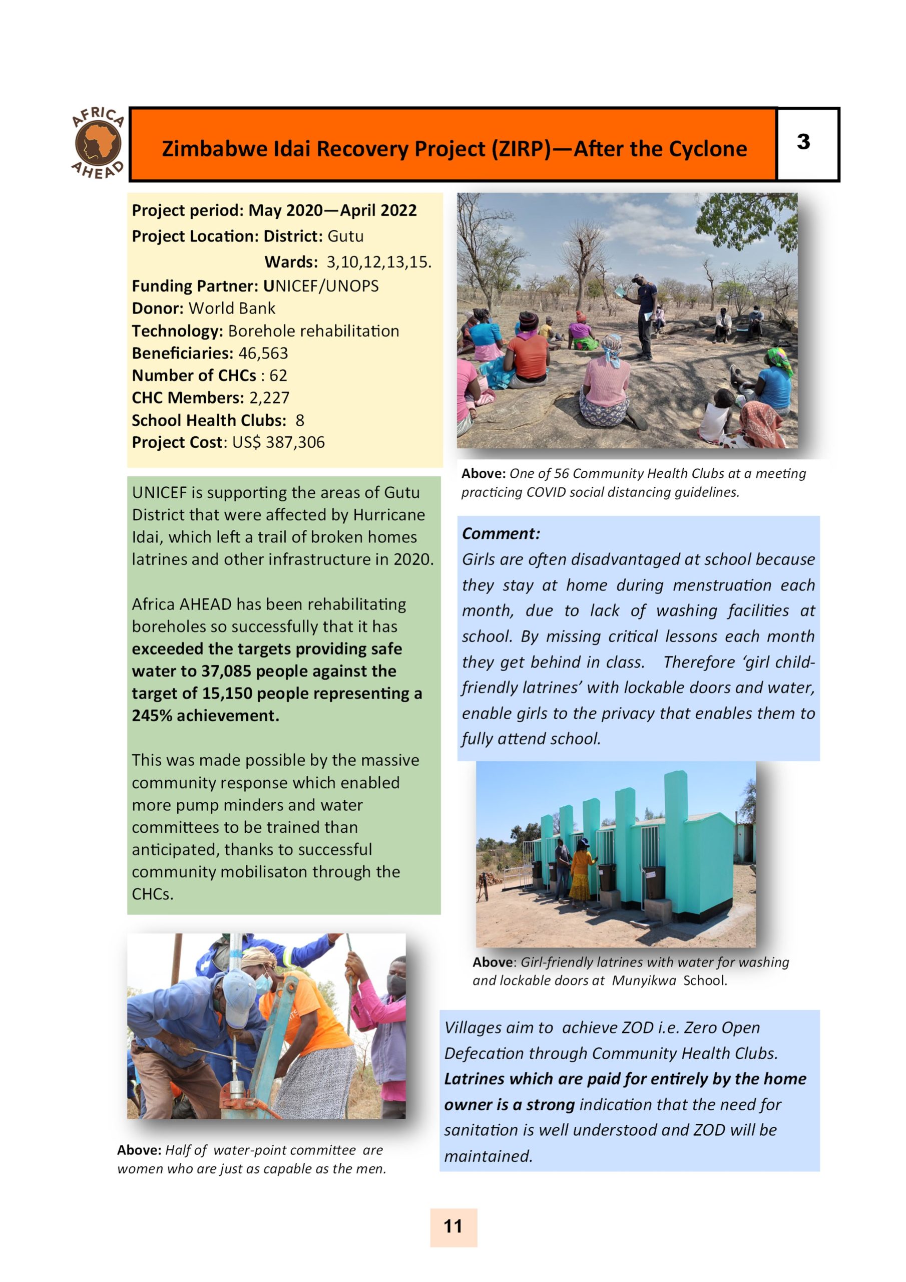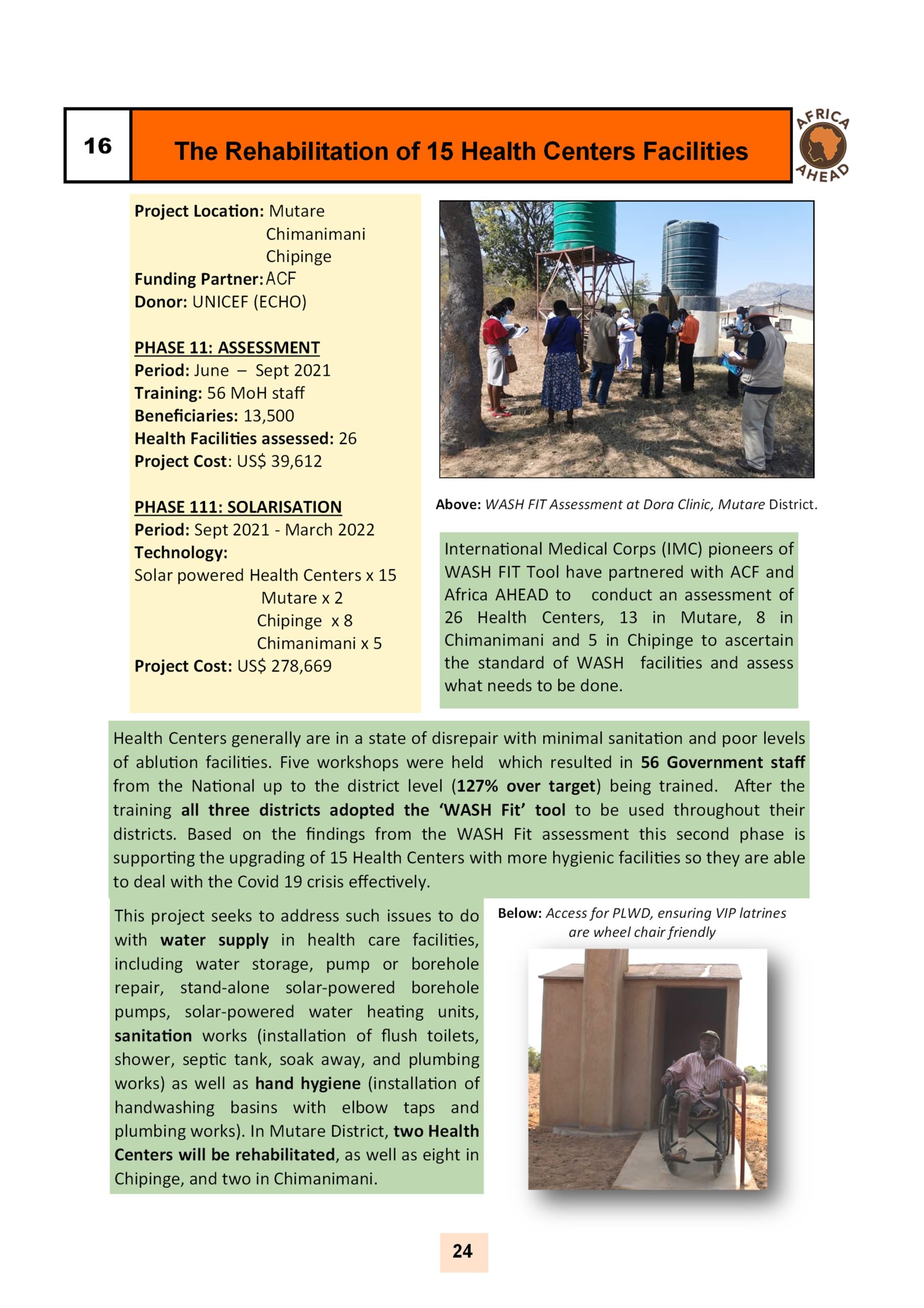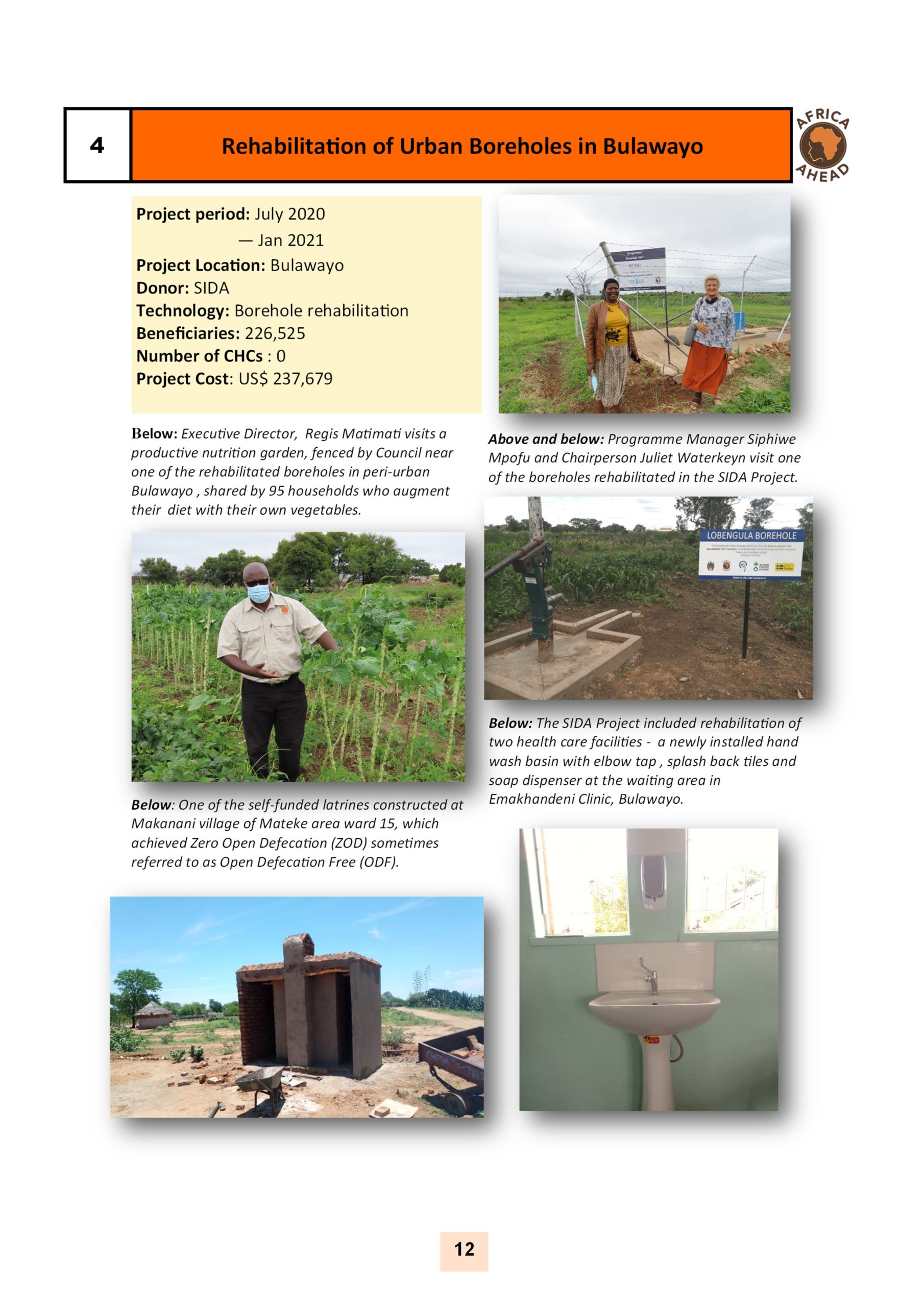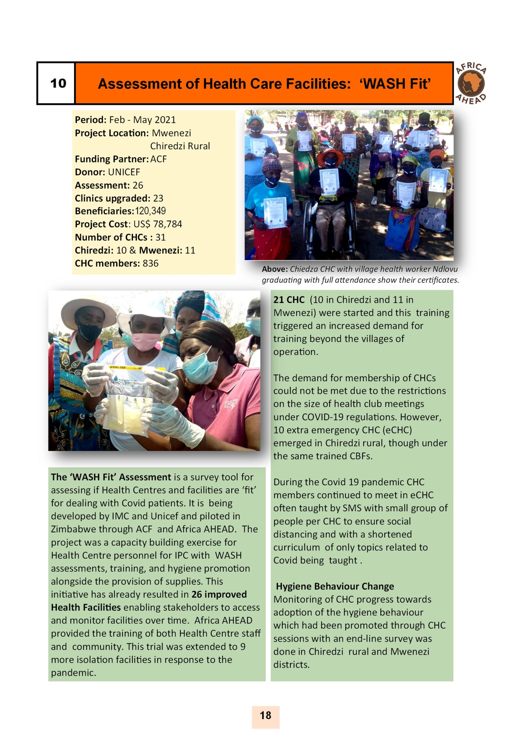The year 2022, sees Africa AHEAD flying high, with projects throughout the country, and a strong role within Zimbabwe for the control of Covid 19, providing handwashing stations, heading health promotion campaigns, road shows, radio programmes as well as upgrading infrastructure at Health Centers around the county, and installing 22 solar powered piped water schemes in rural areas, using our Community Health Clubs to mobilise support and ensure sustainability.