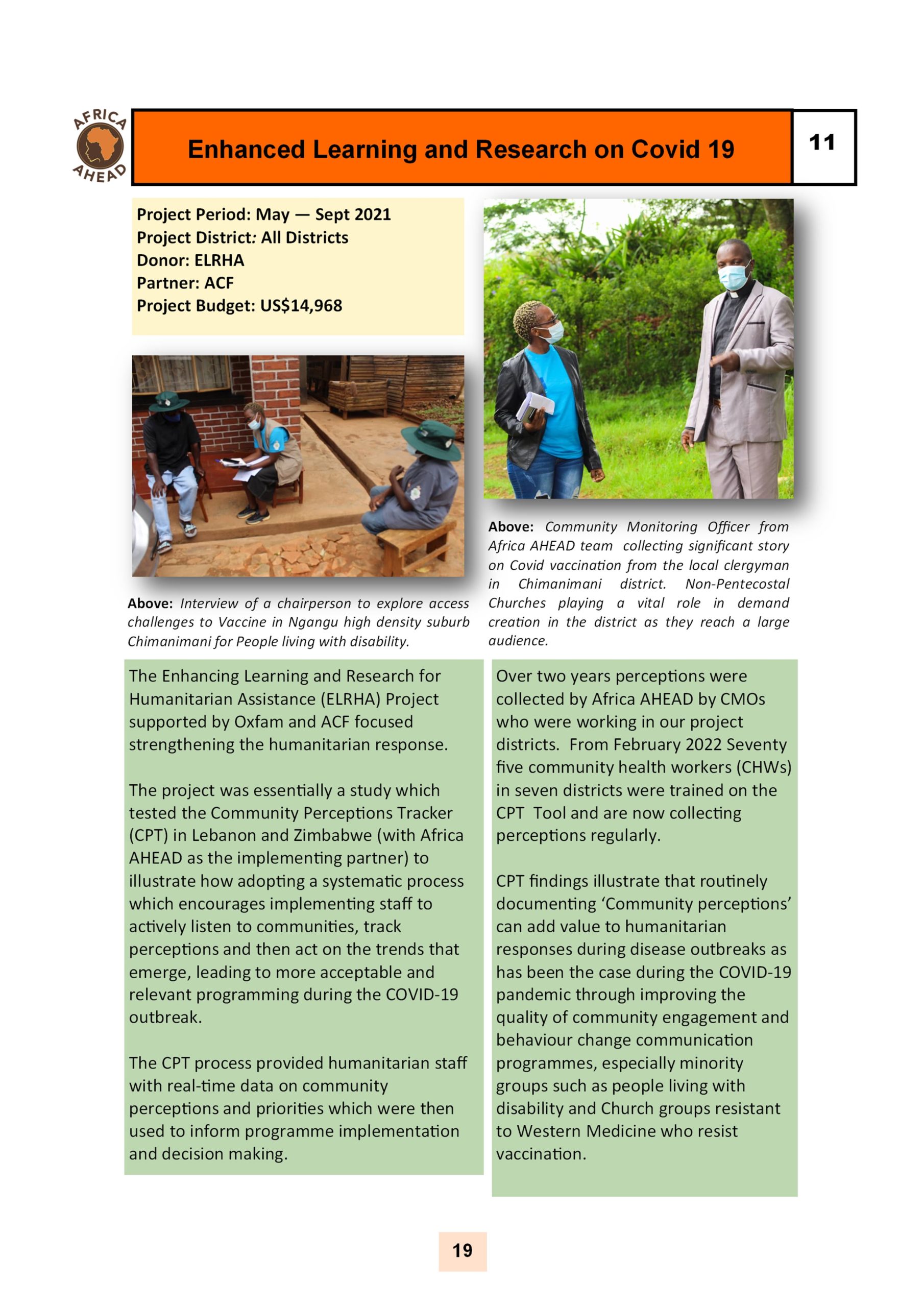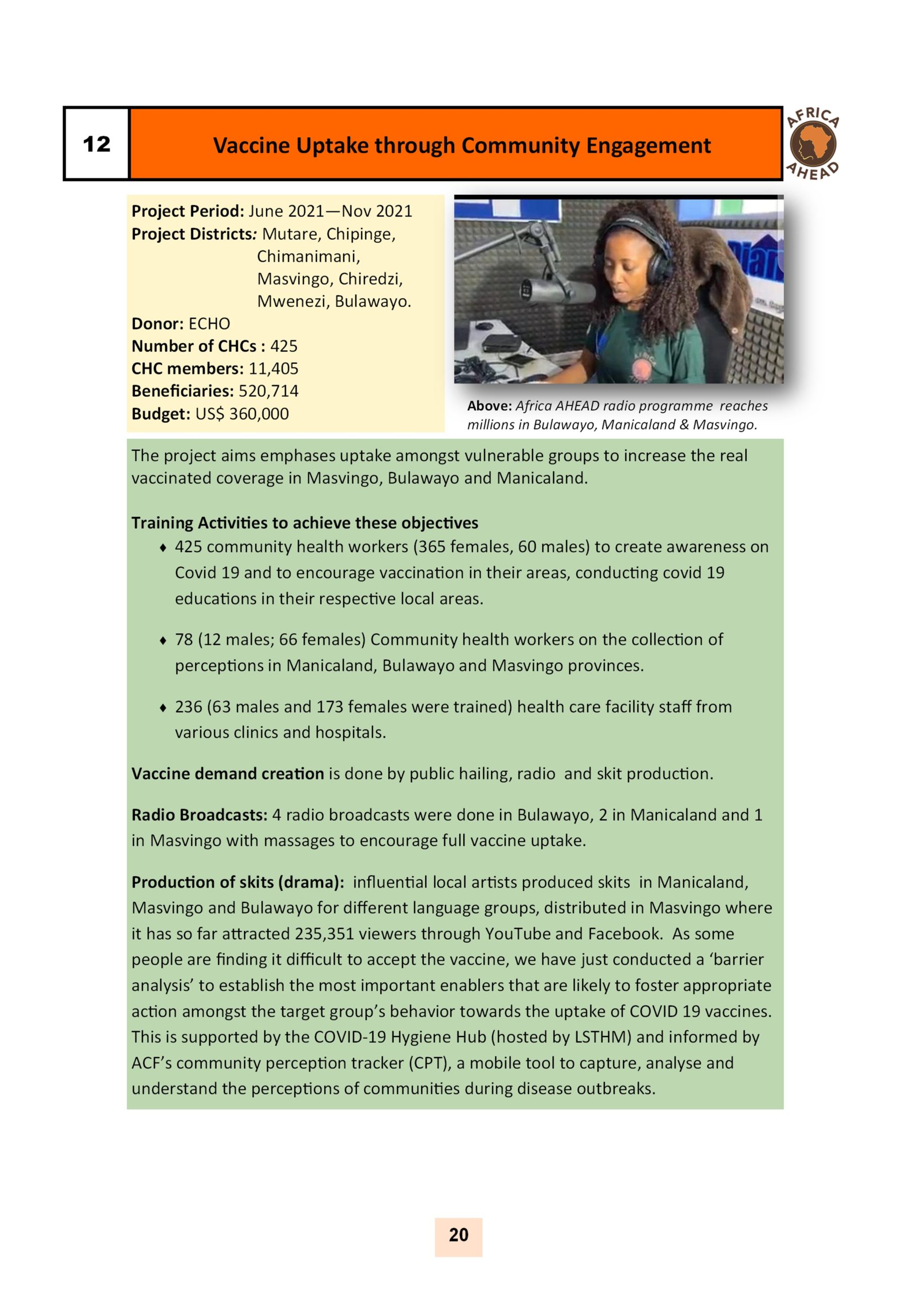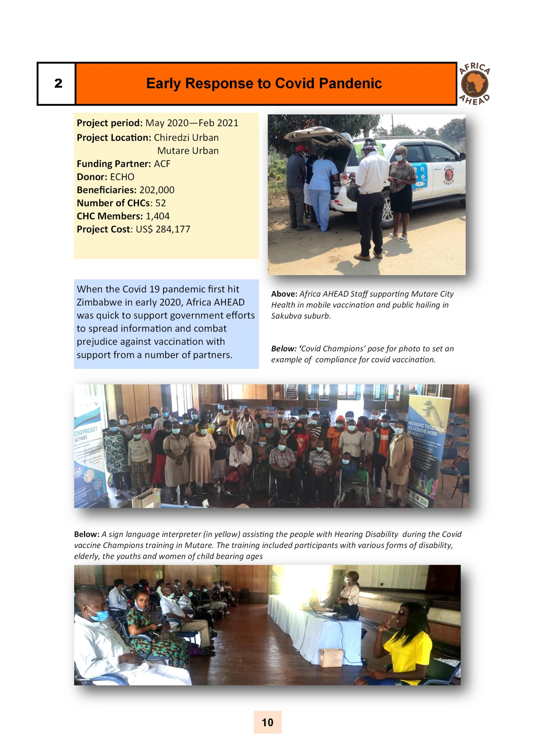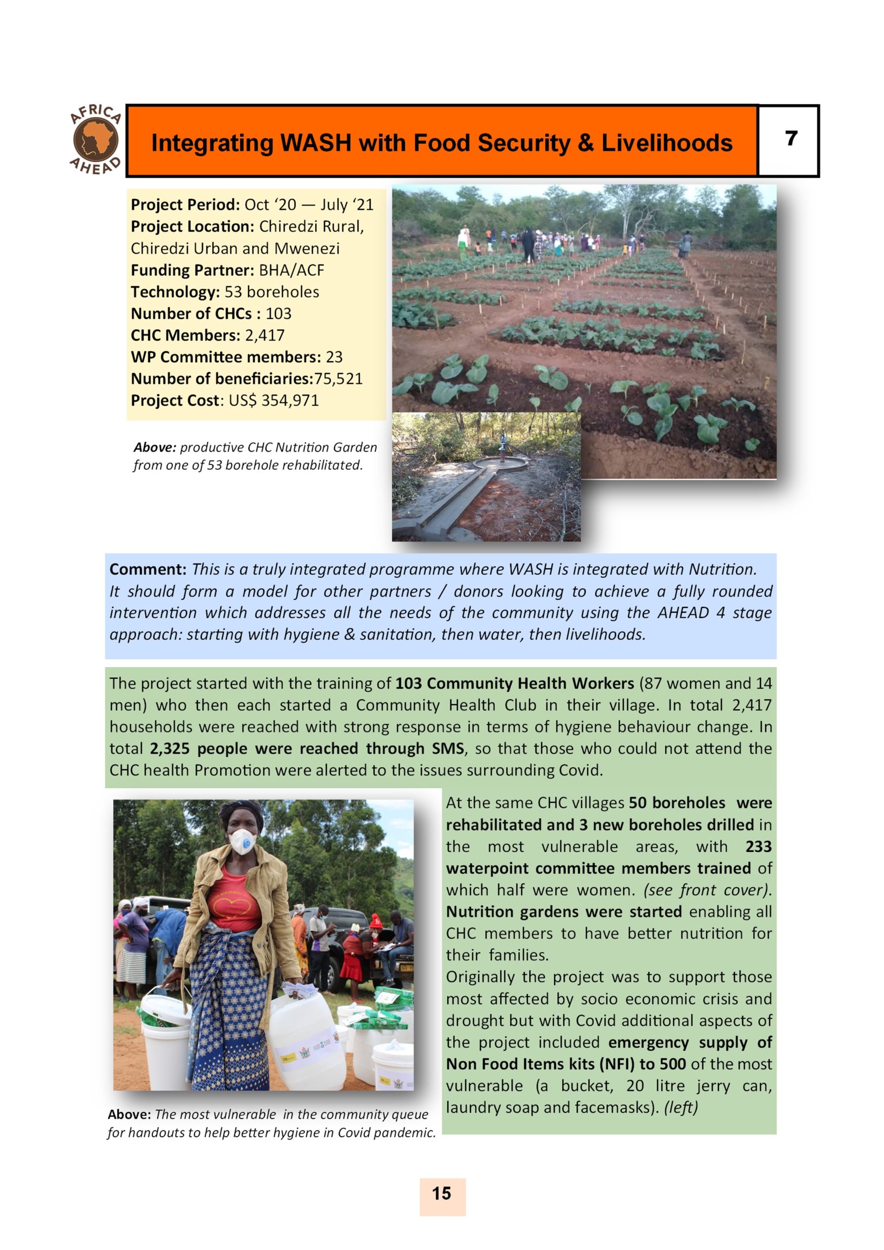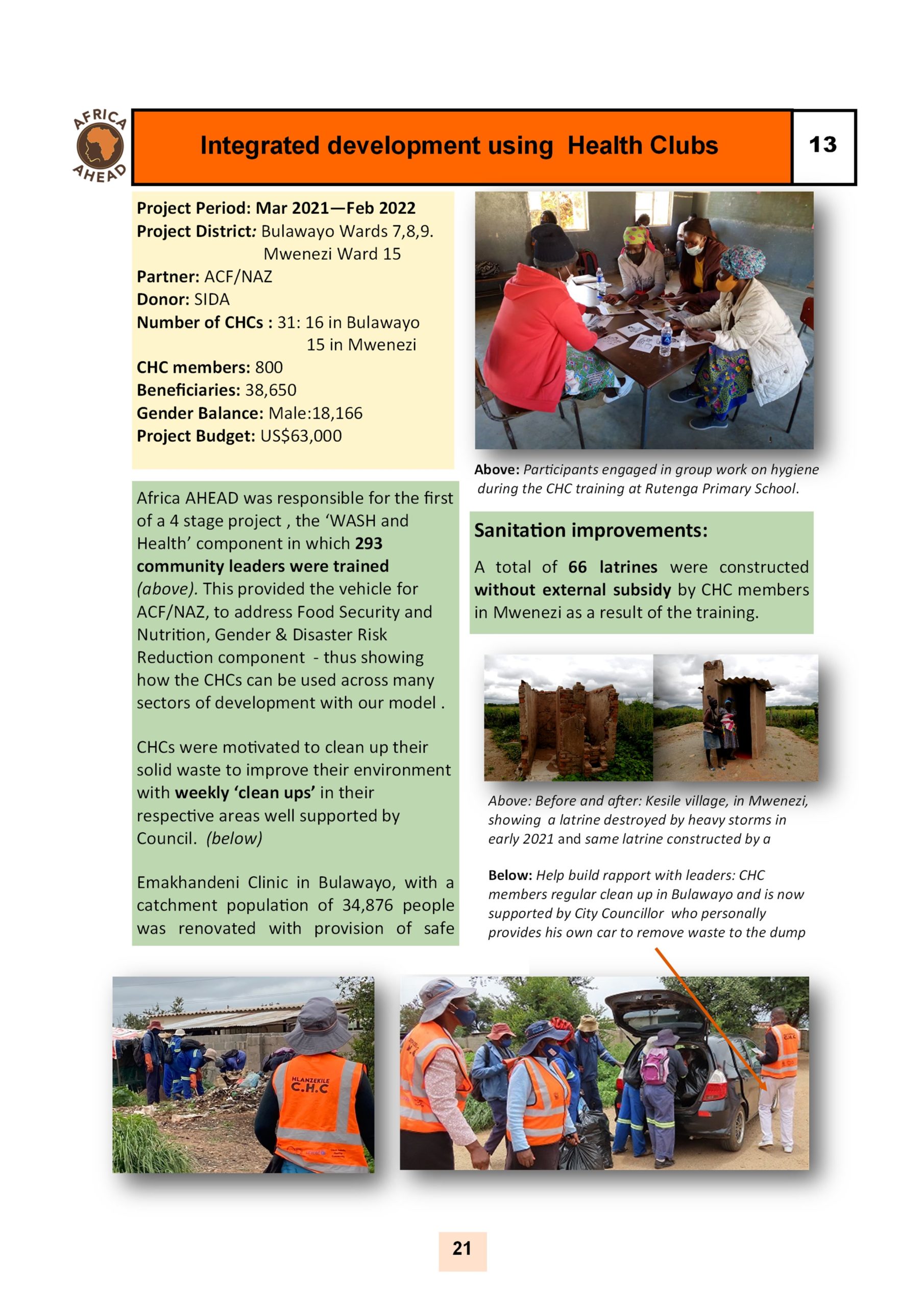 The year 2022, sees Africa AHEAD flying high, with projects throughout the country, and a strong role within Zimbabwe for the control of Covid 19, providing handwashing stations, heading health promotion campaigns, road shows, radio programmes as well as upgrading infrastructure at Health Centers around the county, and installing 22 solar powered piped water schemes in rural areas, using our Community Health Clubs to mobilise support and ensure sustainability.