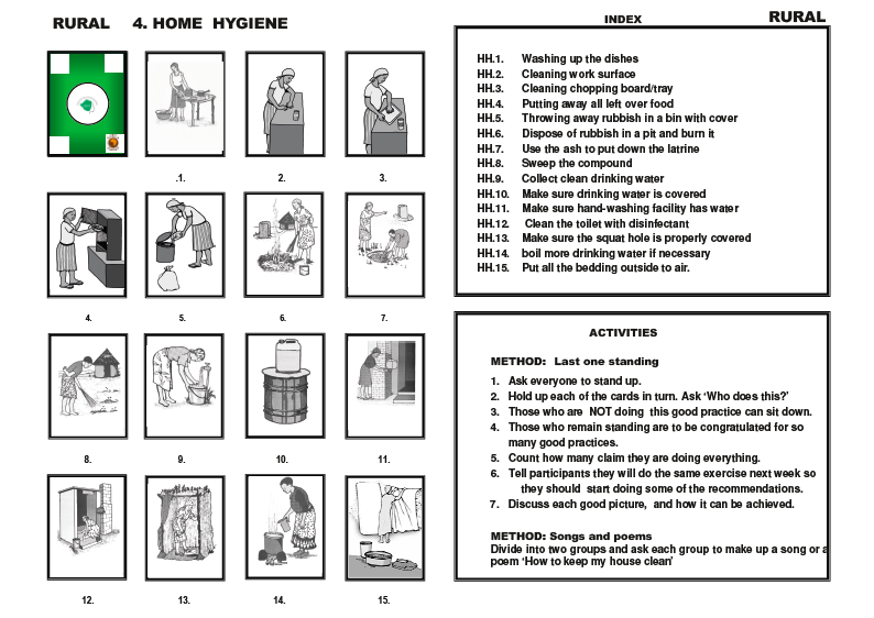 This topic provides 14 images of recommended good home hygiene practices. The cards are used to help prompt participants  to discuss some of the ways that people should keep themselves and their homes clean, with the objective of understanding that many diseases can be prevented by good home hygiene.